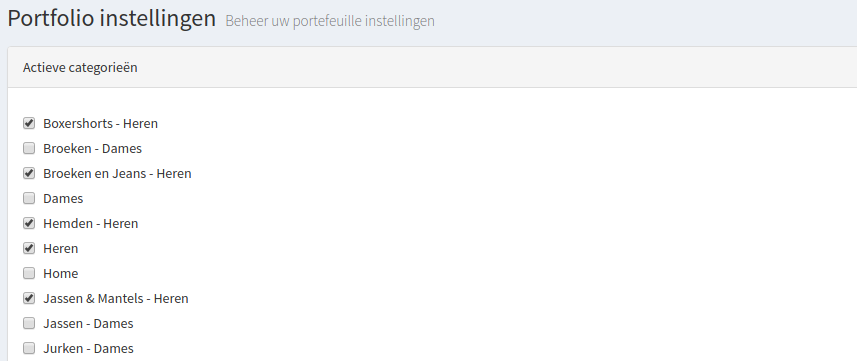 Bij de instellingen kunt u de product categorieën van uw leverancier terugvinden. Per categorie kunt u aangeven of u deze producten wel of niet wilt plaatsen in uw shop. Door een categorie boxje aan te vinken is de categorie geactiveerd laat u het boxje leeg dan worden deze producten niet geactiveerd op uw shop.